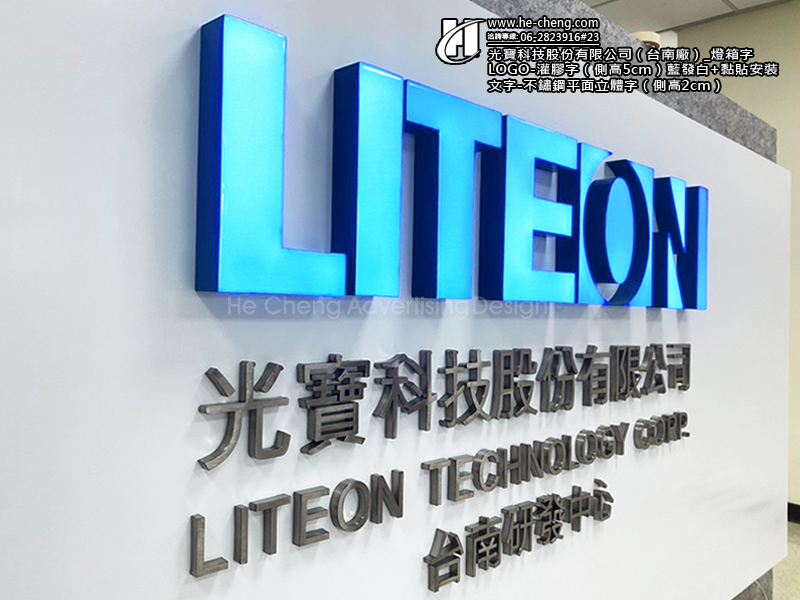 以藍發白燈光層次營造科技感,整體字體飽滿、發光均勻;黏貼安裝工法適合平整牆面,收邊俐落,使LOGO更貼合平面。