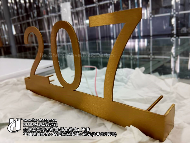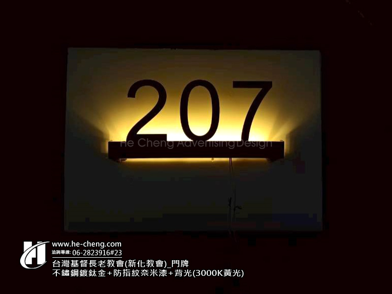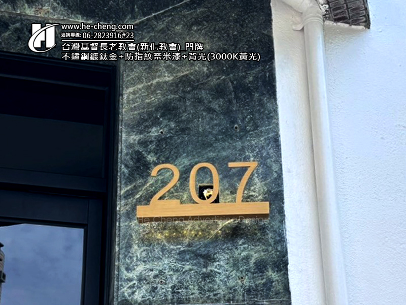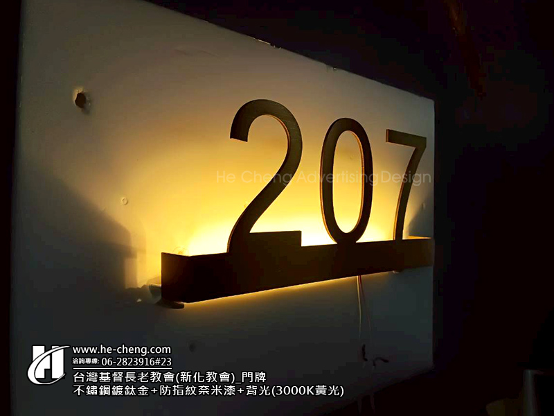 新化教會專屬門牌以毛絲面鍍鈦金字樣結合防指紋奈米漆,搭配背光設計,於白天展現金屬光澤之美,夜間散發柔和暖光,呈現莊嚴而親切的氛圍。