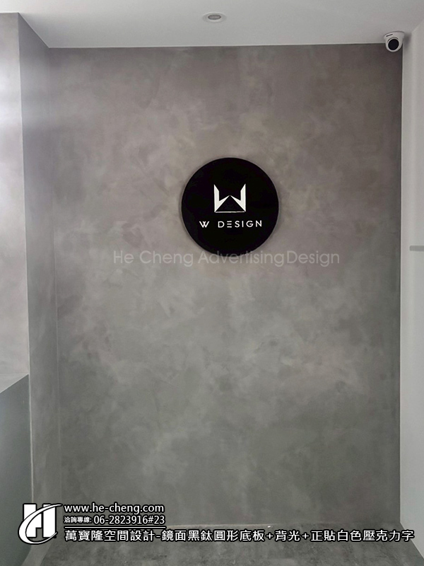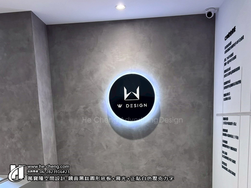 室內LOGO:鏡面黑鈦圓形底板+背光+正貼白色壓克力字