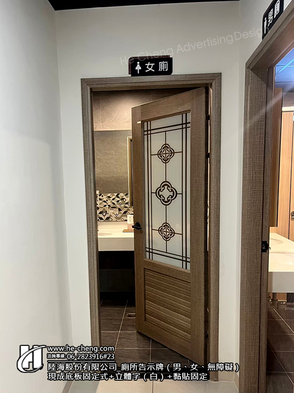 ・廁所告示牌(男、女、無障礙):現成底板固定式+立體字(白)+黏貼固定