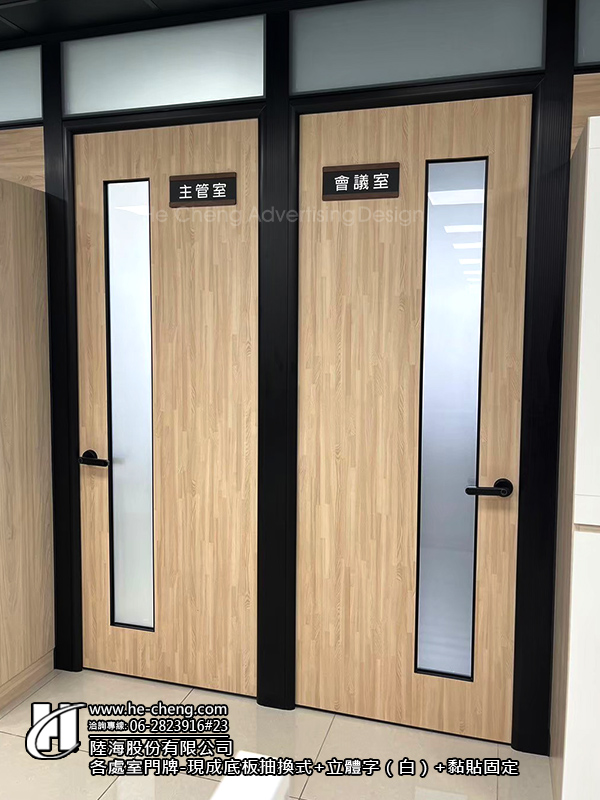 ・各處室門牌:現成底板抽換式+立體字(白)+黏貼固定